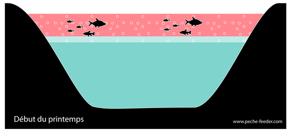 Fin du printemps : Plus chaude, plus légère les eaux de surface commencent à se séparer des eaux froides. L’eau de fond est oxygénée, mais elle est trop froide pour la plupart des poissons. Un vent fort peut encore mélanger les couches d’eau qui sont peut marquées, et ainsi disperser les poissons du lac à n’importe quelle profondeur.